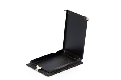 Un porta lastre in matellao per lastre formato 9x12cm costituita da un telaio in metallo con una parete scorrevole completamente apribile e l'altra parete incernierata su un lato corto e anch'essa apribile.