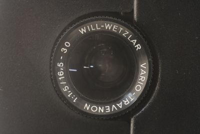 Sopra a questi comandi è inserito l'obiettivo Will Wetzlar Vario Travenon 1:1,5 f=16,5-30mm con messa a fuoco mediante un'apposita rotella collocata lateralmente e dispositivo per regolare la posizione delle linea di divisione tra i fotogrammi.