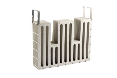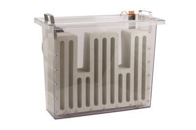 Vasca a sviluppo verticale in materiale plastico trasparente. All'interno è inserita una griglia in materiale plastico bianco, divisa in scomparti, per l'inserimento delle stampe fotografiche da lavare. La griglia è estraibile utilizzando due maniglie laterali in metallo.