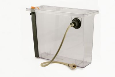 Su un lato della faccia anteriore è inserito un raccordo in plastica che collega la vasca con un tubo in gomma esterno. Sull'altro lato della stessa faccia c'è una striscia in plastica forata tappata nella parte alta e che termina, nella parte bassa, all'interno della vasca con un'altra apertura.