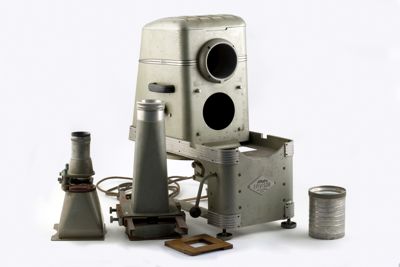 L'obiettivo per la visione di diapositive 24x36mm può essere sostituito con un altro obiettivo della stessa forma, un Aldis Uno f=250mm, con un telaio in legno per positivi trasparenti di formato 12x12cm.