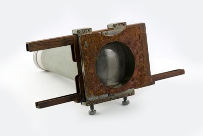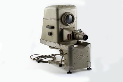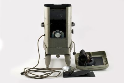 L'epidiascopio è coperto da un cappuccio in tela cerata.