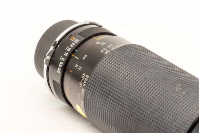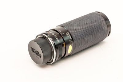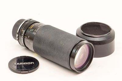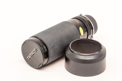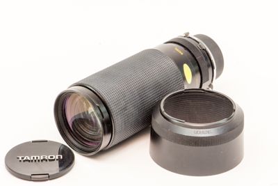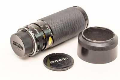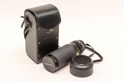 Obiettivo Tamron SP 80-300 mm BBAR MC d62mm (s.n. 512483) con custodia in cuoio (L-18) e paraluce rigido.