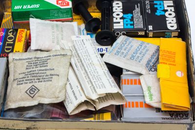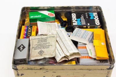 Formati e marchi delle pellicole contenute nella scatola: 6x6, 6x9, 24x36; Agfa, Ilford, Kodak, 3M, GAF.