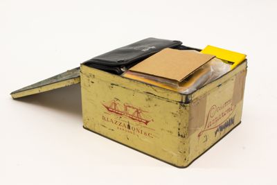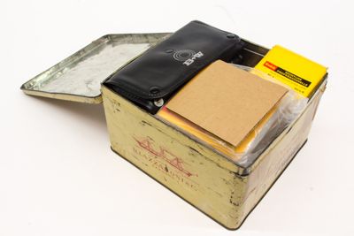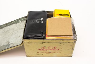 Scatola "Lazzaroni" contenente filtri fotografici di vario tipo e marche.