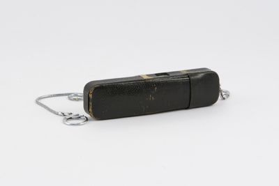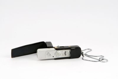 All'apparecchio è appesa una catenella utilizzata per il trasporto e per misurare la distanza di ripresa nel caso di fotografia macro.