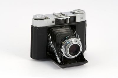 apparecchio fotografico tascabile, a soffietto estraibile, esposimetro interno, pellicola 120