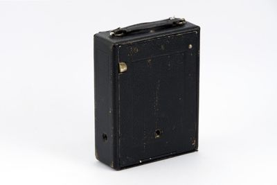 Apparecchio fotografico verticale in metallo ricoperto in pelle di forma parallelepipeda, con maniglia in pelle. E' presente una custodia in cuoio marrone con serratura di chiusura.