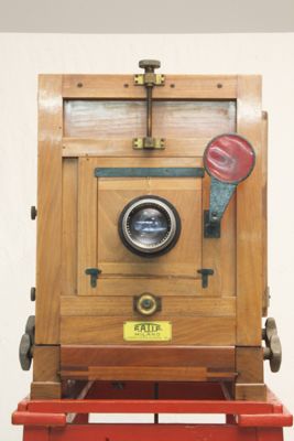 La parte anteriore del apparecchio è costituita da tre telai in legno collegati a due a due da soffietti in cartone ricoperti in pelle. Nel telaio centrale si inserisce, attraverso una fenditura verticale, il porta lastra in legno. All'interno del porta lastra sono inserite tre cornici concentriche che possono essere combinate per inserire lastre di formato: 18x24cm, 13x18cm, 9x12cm. Questi portalastre possono ruotare per visionare sia riprese orizzontali che verticali.Agendo su due rorelle laterali è anche possibile modificare la posizione verticale.