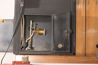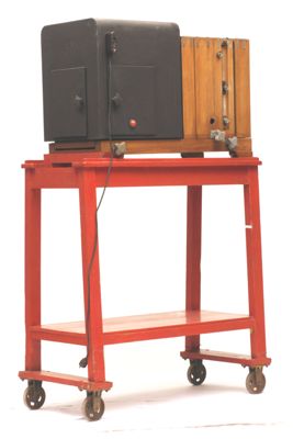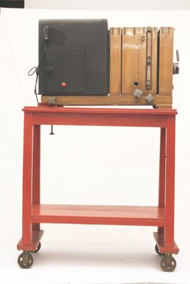 Tutto l'apparecchio poggia su un cavalletto in legno verniciato di rosso con rotelle per facilitarne il trasporto.