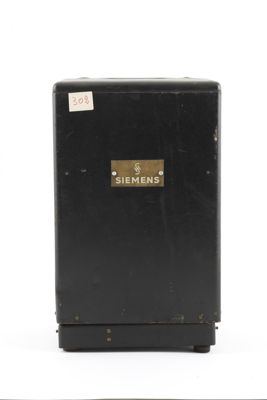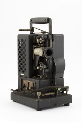 Proiettore cinematografico in metallo, di forma vagamente parallelepipeda poggiante su piedini ad altezza regolabile con maniglia per il trasporto. Il proiettore è coperto interamente da un coperchio in metallo con una fessura che permette la fuoriuscita della maniglia.