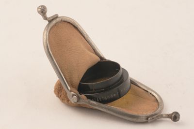 Il filtro è conservato in una custodia in pelle marrone di forma allungata con chiusura in metallo, tipo porta monete.
