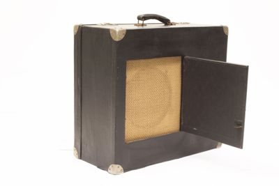 Altoparlante circolare inserito in una valigia in legno e metallo con maniglia in cuoio.