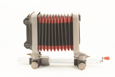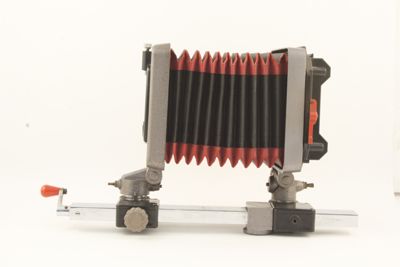 Apparecchio fotografico da studio in metallo con soffietto in cartone ricoperto in pelle, montato su una monorotaia ovvero un'asta a sezione rettangolare in metallo.