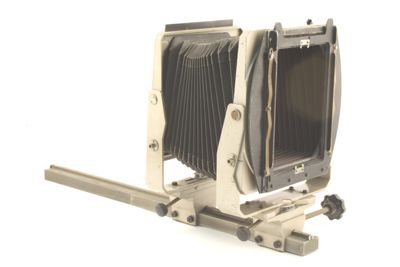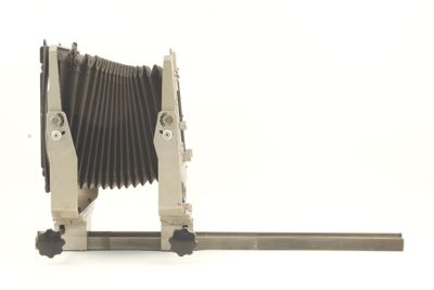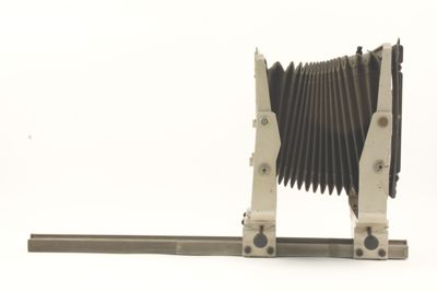 Apparecchio fotografico da studio in metallo con soffietto in cartone ricoperto in pelle, montato su una monorotaia ovvero un'asta a sezione rettangolare in metallo.