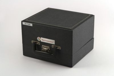 Il proiettore è conservato in una custodia in legno ricoperta in pelle grigio scuro apribile in due parti, con serratura di chiusura e maniglia in bachelite.