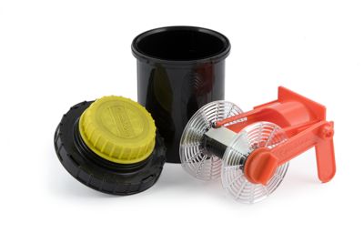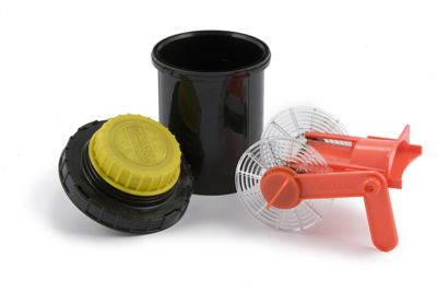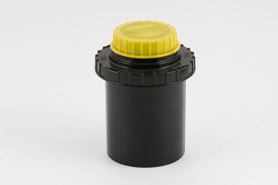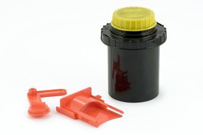 Bacinella cilindrica in materiale plastico nero resistente agli acidi chiusa da un coperchio dello stesso materiale. Sul coperchio si ha un tappo in plastica gialla apribile che permette l'accesso ad una guida cilindrica probabilmente per l'inserimento di un termometro e ad un imbuto per versare il liquido di sviluppo all'interno della sviluppatrice.