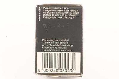 Rullino di pellicola fotografica 35mm per diapositive a colori. Il rullino è contenuto in un cilindro in plastica con tappo, a sua volta inserito in una scatoletta in cartoncino riportante i dati tecnici della pellicola e il marchio del produttore. Il rullino è in metallo e contiene al suo interno la pellicola da impressionare arrotolata attorno ad un fuso centrale che può ruotare. Una linguetta di pellicola fuoriesce dal rullino.