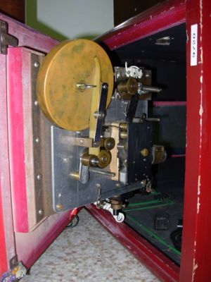 Una parete laterale è apribile e al suo interno è fissato un proiettore elettrico per pellicole 8mm. Sulla parete posteriore, all'interno, è fissato, in posizione inclinata, uno specchio. Lo specchio è collocato su uno sportello apribile.