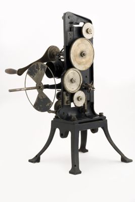 Proiettore cinematografico da tavolo in metallo, a sviluppo verticale. E' presente la struttura complessiva ma mancano l'obiettivo, il dispositivo illuminante, i bracci in cui si inseriscono le bobine.