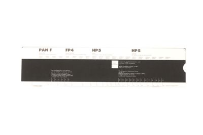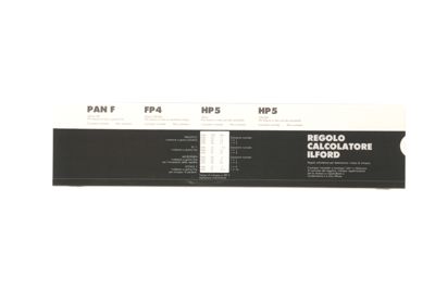 Custodia in plastica rettangolare nella quale scorre un righello in cartoncino. Su un lato del cartoncino sono indicate diverse pellicole Ilford (PAN F 35mm/ 120 film bianco e nero a grana fine, FP4 35mm/120/220 film bianco e nero di sensibilità media, HP5 35mm film bianco e nero ad alta sensibilità, HP5 120/220 film bianco e nero ad alta sensibilità) e per ciascuna si hanno due colonne di valori, una per contrasto normale e l'altra per alto contrasto, contenenti per diverse sensibilità della pellicola (da 25ASA a 500ASA o da 15DIN a 28DIN) i tempi di sviluppo necessari (da 3 a 30 minuti). Questi dati vanno letti sulla parte plastica del regolo, in corrispondenza di una finestra sulla quale sono indicate le tipologie di rivelatore (PERCEPTOL rivelatore a grana extrafine, ID 11 rivelatore a grana fine, MICROPHEN rivelatore a grana fine per l'incremento della rapidità, ILFOSOL 2 rivelatore a grana fine per sviluppo "a perdere") e il tipo di soluzione normale (da 1+1 a 1+14). I dati si riferiscono a tempi di sviluppo a 20°C e con agitazione intermittente.