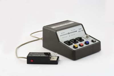 Dispositivo elettronico di forma trapezoidale. Sulla parete superiore sono inseriti i comandi. Tre pulsanti di colore giallo, magenta, ciano con relativi contatori. Accanto si hanno un timer per programmare il tempo di esposizione e un pulsante di accensione.