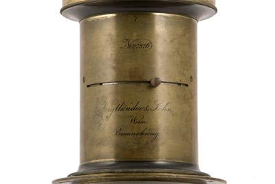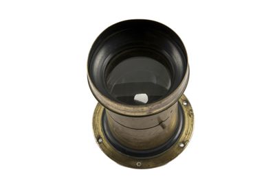 Questo obiettivo di grosse dimensioni, in metallo, ha forma cilindrica e termina da un lato con una flangia circolare per il posizionamento sul porta obiettivo di un apparecchio fotografico.