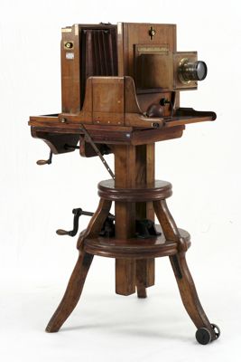 Apparecchio fotografico montato su cavalletto da studio, entrambi prevalentemente realizzati in legno.