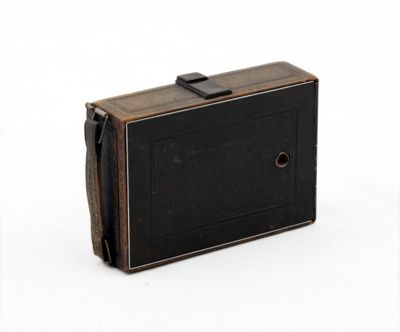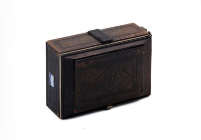 Apparecchio fotografico verticale in metallo ricoperto in pelle , di forma parallelepipeda, con maniglia in pelle.