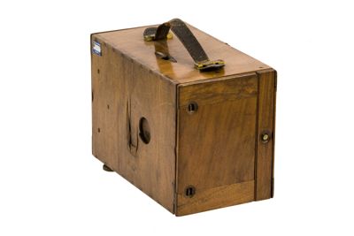 Questo apparecchio fotografico di piccole dimensioni, costruito in legno, ha forma parallelepipeda e maniglia in cuoio per il trasporto.