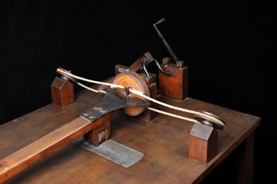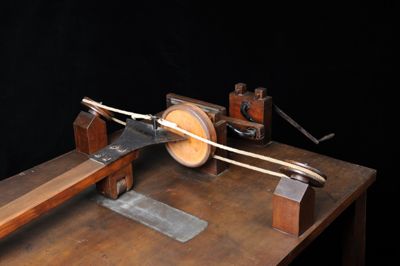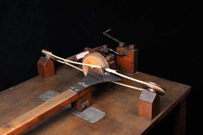 Il modello è costituito da una struttura di legno su cui è collocato un disco di legno (su cui era montato lo specchio, mancante) collegato a una manovella. La stessa manovella è collegata attraverso una biella e una barra a due dischi. I due dischi sono uniti da una corda a cui è collegato il settore di rame che ha la funzione di levigare. Il settore è montato su una lunga asta che fa perno all'altra estremità della struttura: è messa in tensione da un peso.