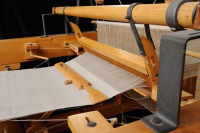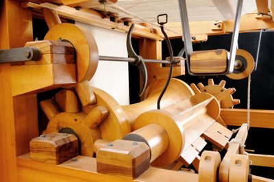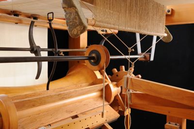 Tutte le azioni e i movimenti necessari a formare il tessuto sono forniti da un unico albero che può essere mosso a mano da una persona grazie a una manovella.