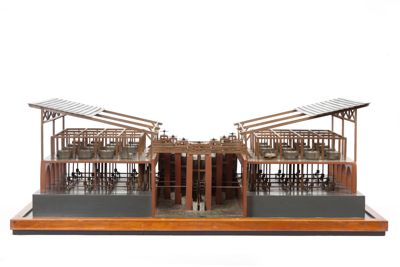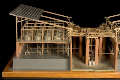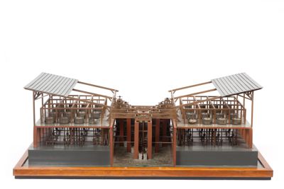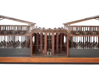 Il modello rappresenta un sistema di mulini multipli lungo un corso d'acqua. Quattro serie di ruote idrauliche poste lungo il canale sono collegati ad altrettanti alberi di trasmissione, che ingranano 32 macine (sedici per parte). I due sistemi di macine sono coperti da una tettoia (di invenzione, non è presente nel disegno di Leonardo).