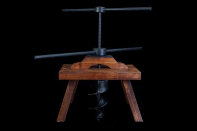 Il modello rappresenta una trivella formata da una vite senza fine ancorata a una struttura di legno a quattro piedi. La vite è azionata da due barre: una le permette di girare scendendo, l'altra la solleva tenendola ferma.