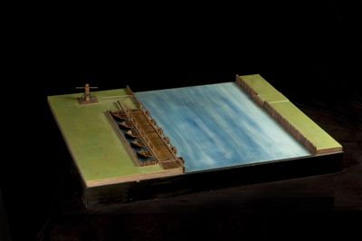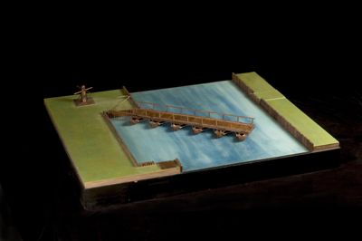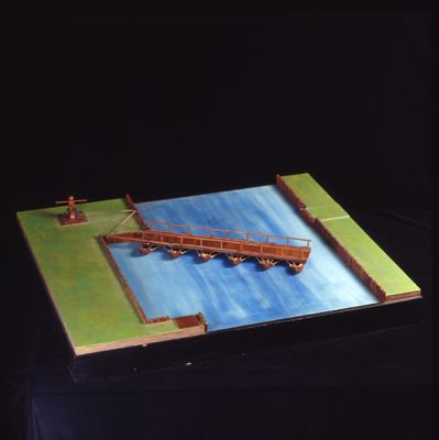 Il modello rappresenta un ponte girevole su un corso d'acqua costituito da una serie di assi inchiodate su sei barche. Due parapetti proteggono il passaggio. Il ponte è collegato alla banchina da un perno e da una corda mossa da un argano. La banchina è costituita da una rientranza palificata (così come gli argini del fiume).