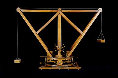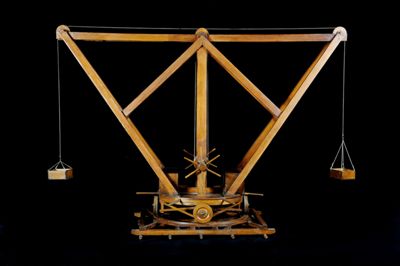 Il modello rappresenta una gru a doppio braccio montata su un piattaforma circolare. Quest'ultima può ruotare su se stessa grazie a ruote che scorrono su un binario circolare. La piattaforma è posta su un basamento appoggiato a tronchi di legno. Sui due bracci scorrono le casse portapesi, collegate tramite due corde a un rocchetto. Al rocchetto sono collegati due argani provvisti di meccanismo di arresto