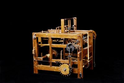 Il modello rappresenta un telaio con l'ordito dotato di un sitema di trascinamento automatico, e collegato ai licci e alla navetta lanciata automaticamente.
