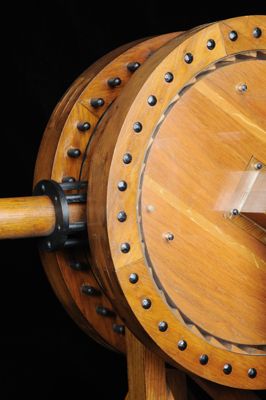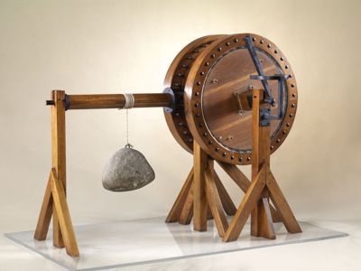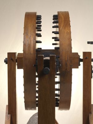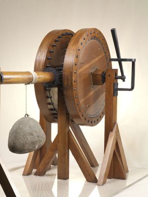 Il modello interpreta uno studio di argano per sollevare pesi, trasformando il moto alterno della leva in moto circolare continuo dell'albero. E' costituito da una struttura in legno sulla quale è montato un'albero con peso e pignone. Il pignone ingrana una coppia di tamburi inscritti in due corone a cremagliera. I tamburi sono montati su un'asse collegato a una leva. Le coperture in plexiglass dei due tamburi, così come la base sempre in plexiglass, sono aggiunte posteriori.