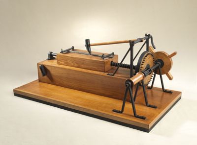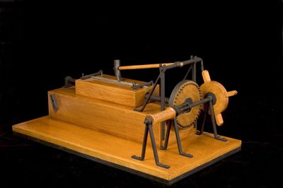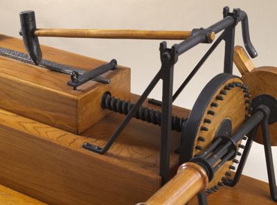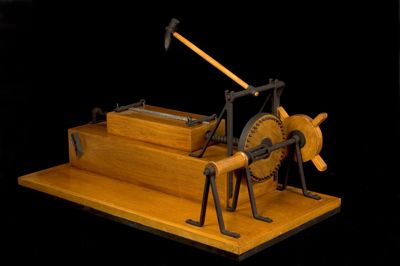 Questa modello interpreta uno studio di macchina per intagliare le lime meccanicamente: è costituito da una base in legno su cui scorre un carrello collegato a una vite senza fine, a sua volta collegata tramite ingranaggio e pignone a un albero di trasmissione. A una delle estremità dell'albero una ruota a quattro denti ingrana un perno a sua volta collegato a un martello. Sull'albero di trasmissione è collocato anche un rocchetto.