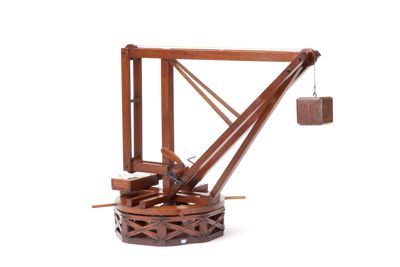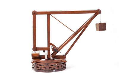 Questo modello è un'interpretazione di uno studio per una gru girevole, a braccio singolo, montata su un piattaforma circolare. Quest'ultima può ruotare su se stessa grazie a ruote che scorrono su un binario circolare. Il braccio ha due travi trasversali di rinforzo, e sta sollevando un peso tramita una corda che si avvolge su pulegge e infine su un rullo comandato da due manovelle laterali. Al rullo è collegata anche una ruota dentata fornita di dente d'arresto.