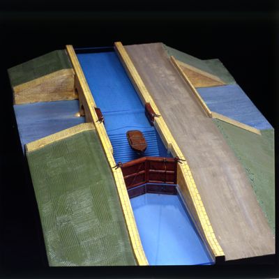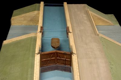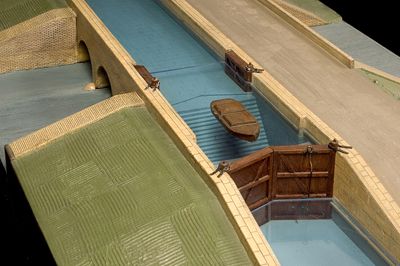 Il plastico rappresenta un canale navigabile che scavalca un corso d'acqua attraverso un ponte. Il canale, su cui è un'imbarcazione, è dotato di una conca.