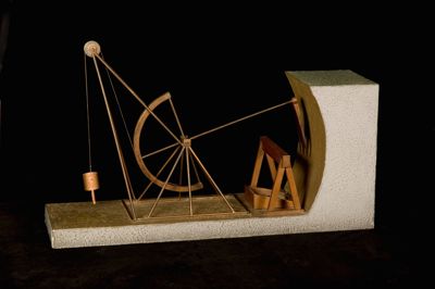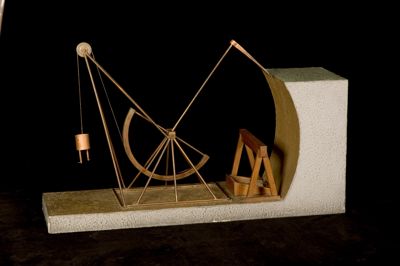 Questo modello è un'interpretazione di uno studio per una scavatrice di trincee per canali o fossatiIl: è costituito da un braccio rotante su un perno. A un'estremità c'è la zappa, all'altra un bilanciere a mezzaluna a cui è collegato un peso tramite una corda. Scavatrice, bilanciere e peso sono tutti montati su una stessa struttura metallica. La scavatrice è posta in prossimità di una sezione di trincea di canale, ai piedi della quale sta una transenna di legno e del materiale da costruzione