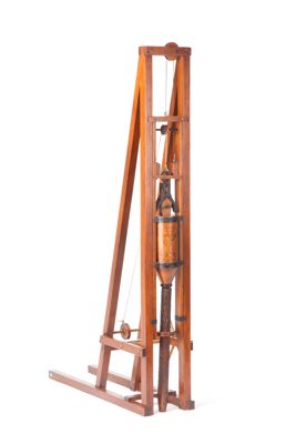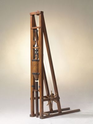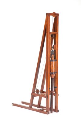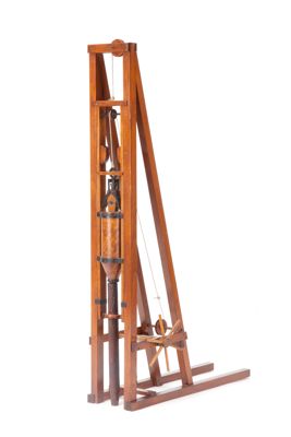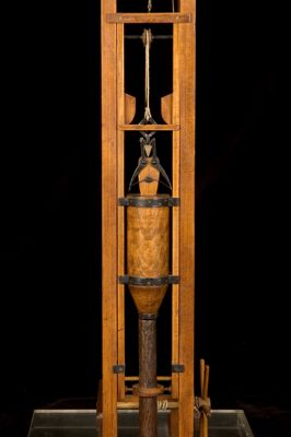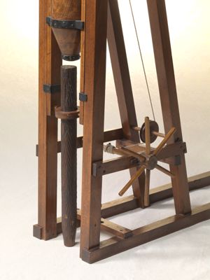 E' costituito da un grande maglio cilindrico che scorre in una struttura di legno verticale. L'estremità superiore del maglio termina con una molletta metallica che lo aggancia a una guida collegata a un argano. Sotto il maglio si trova un tronco tenuto in posizione da un anello. L'argano è azionato da una ruota dentata posizionata nella parte inferiore destra. La ruota ha un dente di arresto che le impedisce di girare in senso contrario.