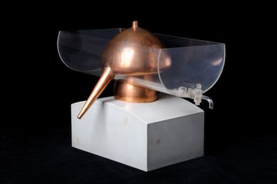 Il modello è un'interpretazione di uno studio per un alambicco in rame posto in una vasca di plexiglass. Dalla vasca fuoriescono il lungo becco dell'alambicco e un rubinetto in plexiglass.