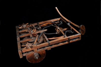 Il modello è costituito da una struttura di carro a tre ruote, più una quarta montata su una lunga sbarra. Le ruote sono collegate tramite ingranaggi a due molle a balestra che possono essere caricate da due manovelle che ingranano altrettante cremagliere.