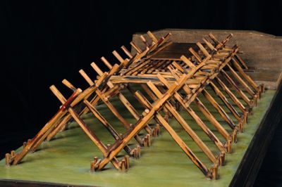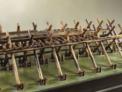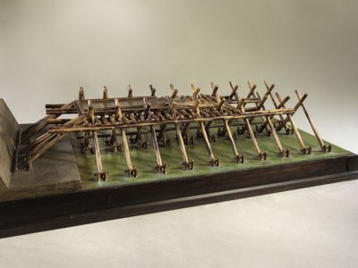 Il modello rappresenta un ponte provvisorio costituito da un impalcato sostenuto da una doppia fila di cavalletti. L'impalcato li ricopre solo per un terzo, lasciando scoperta la parte restante mostrando la successione delle fasi costruttive.