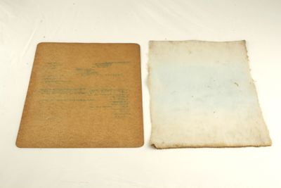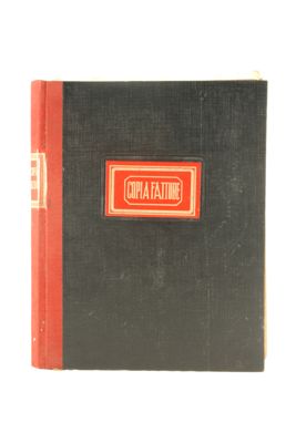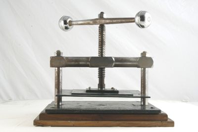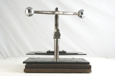 Torchio in ghisa, fissato su una base in legno e costituito da una pressa azionata da un sistema vite-madrevite. La traversa del torchio e il manubrio della vite sono cromati, mentre la platina e la base sono verniciate di verde scuro. Il copialettere รจ accessoriato con un registro copia fatture e con due pezze di tessuto spugnoso.