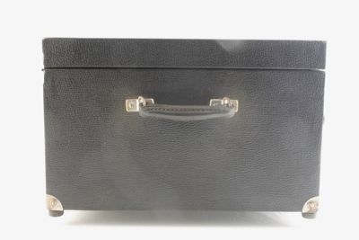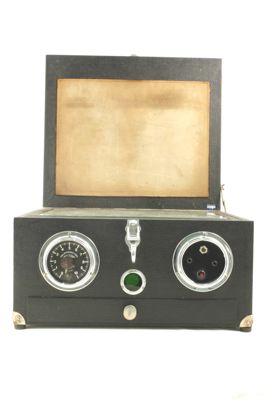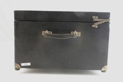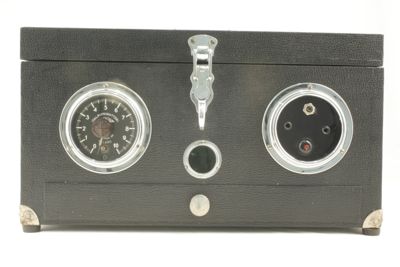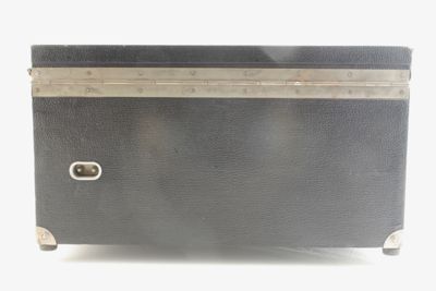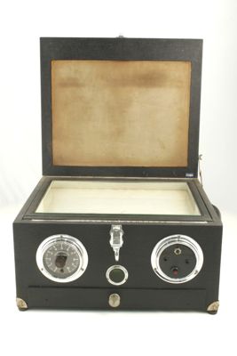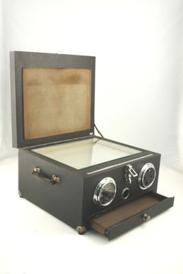 Macchina con struttura in legno, rivestita esternamente di tela cerata di colore blu elettrico. Ai lati della macchina sono presenti due maniglie. Il coperchio, rivestito internamente con spugna, è fissato con una giuntura a pantografo. All'interno si trova un piano di lavoro in cristallo che ricopre la cassa contenente quattro lampade. Al di sotto della lastra di cristallo inoltre si trovano due lastre di vetro, tra le quali è inserito un foglio plastificato bianco. Nella parte frontale si trovano la serratura a gancio e due quadranti circolari: nel quadrante sinistro è situato l'orologio contaposa, mentre nel quadrante destro, in ebanite, si trovano due interruttori indipendenti. Tra i due quadranti si apre un oblò più piccolo, col vetro di colore verde, che funge da spia di controllo per l'illuminazione della cassa. Sempre sul lato frontale si apre un cassetto fornito di un'impugnatura centrale in ebanite. Sul retro della macchina si trova l'attacco per il cavo elettrico.