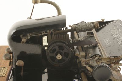 La macchina è installata su un basamento rettangolare in legno, predisposto alla chiusura con un coperchio. Il telaio metallico è verniciato di nero. La parte sinistra della macchina è costituita da un quadrante rettangolare su cui sono riportati lettere, numeri e segni di interpunzione; sul quadrante si muove un puntatore connesso al cilindro portacaratteri. Il cinematico è ricoperto da un calotta protettiva, dalla quale sporgono due tasti argentati. Un terzo tasto è posizionato a destra della calotta. Ai lati della calotta sono inoltre sistemati due portanastri in posizione verticale. Dal punto di vista tipologico, questa macchina può essere considerata sia ad indice posizionabile, dato che la scelta del carattere da stampare avviene mediante indice, sia ad elementi intercambiabili, visto che è possibile cambiare l'alfabeto sostituendo il cilindro portacaratteri e il quadrante