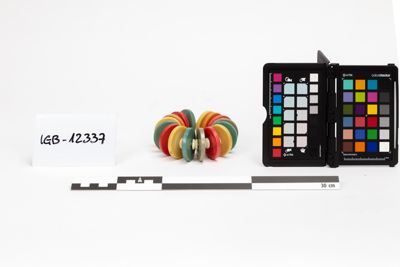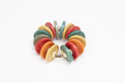 Bracciale composto da dischi di plastica colorata, datato circa 1950.